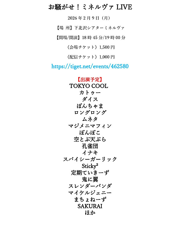 【時間】開場 20:05 / 開演 20:15 / 終演 21:35(開場時間を過ぎましたらご入場ください。)