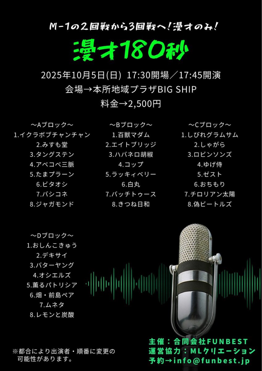 出場者一覧 A DAMチャンネルをご覧の皆様(アマチュア) A ナスカ(アマチュア) A ラントス(アマチュア) A イケタナ(アマチュア) A マンデーポジティブ(アマチュア) A muscle武術格闘技研究会(アマチュア) A ツインスパーク(アマチュア) A ズボ吉(アマチュア) A 西日マシマシ(アマチュア) A 西尾市長と抹茶さん(アマチュア) A どたばたスチューデント(ラフィーネプロモーション/アマチュア) B 獅子舞(アマチュア) B ピンク²(松竹芸能) B しじみ汁(アマチュア) B 犬畜生(アマチュア) B ラブロマンス(アマチュア) B 南口(アマチュア) B 僕のスウィーティー(フリー) B 東京山月記(タイタン/フリー) B シト・カオル(ビクターミュージックアーツ) B エスコート(フリー) C ミナミ(アマチュア) C ペガ素数(アマチュア) C 獄中結婚(アマチュア) C バーズ(アマチュア) C 気づいたら2時(アマチュア) C ドラムンベースミニマリズム(アマチュア) C 桃色タンメン(アマチュア) C 男子ング大根(アマチュア) C 達磨ダンディー(プロダクション人力舎/フリー) C ボダリキボバイ(吉本興業) D 俺は学校か(アマチュア) D 水鏡(アマチュア) D グランド・カノニカル・アンサンブル(アマチュア) D メモ帳(アマチュア) D 紅メランコリィ(アマチュア) D ちまなこ(アマチュア) D インビボピーポー(アマチュア) D ラクジャ(K-PRO) D シルバートン(フリー) D アノマノ☆カリス(吉本興業) E きらきらサイエンス(アマチュア) E 犬はさておき。(アマチュア) E 造園(アマチュア) E バクキムチ(吉本興業) E 低い高い(アマチュア) E ミートパパイヤ(アマチュア) E エイカム(吉本興業) E 首席(アマチュア) E フィッシュアンドゼットス(フリー) E チャイルドシーターズ(松竹芸能) F イエローシープ(アマチュア) F 2世帯住宅なんのその(アマチュア) F なんで頑張れねぇの(アマチュア) F ボルトアンドナット(アマチュア) F ガリバーズ(アマチュア) F ℃ccc(アマチュア) F ブルバンブース(アマチュア) F アキミツヒロシ(アマチュア) F さかもとくんとあゆちゃん(ワタナベエンターテインメント) F ペリカン生活(吉本興業) G 春日部方面(アマチュア) G 鯉鷹(アマチュア) G 光るお寿司(アマチュア) G 街中モーモーフェスティバル(アマチュア) G ザ・ホルモンズ(アマチュア) G NOT FOUND(アマチュア) G でかいドカン(アマチュア) G 堂々完成!感性ズマンション(アマチュア) G 仮コンビ(フリー) G 黒腕(吉本興業) H さつき01(アマチュア) H あんずとさとりょー(アマチュア) H パワフル笑集(アマチュア) H タロッピー(アマチュア) H 寒蝉(アマチュア) H 夕焼けサロン(アマチュア) H 健康レストラン(吉本興業) H エクスプレッソ(太田プロダクション) H じゅんじゅんズ(フリー) H コールセンターの同僚(トゥインクル・コーポレーション) I デッドヒート(アマチュア) I カニ祭り(アマチュア) I 奈織(アマチュア) I ビジュロマンティック(アマチュア) I さとみつ(アマチュア) I コバサラ(アマチュア) I リュックサック天国(アマチュア) I いぬとねこ(松竹芸能/アマチュア) I ファイティングボンバー(フリー) I 道すがら新小岩(吉本興業) J ますむね(アマチュア) J 10年前の君と僕(アマチュア) J てづくりバニラ(アマチュア) J 永い残響(アマチュア) J 住みます!シダックスカルチャーホール(アマチュア) J 回鍋肉半分あまり(アマチュア) J マラーライ(アマチュア) J あらいざらい(フリー) J 恋涙(太田プロダクション/ライジング・アップ) J 中村ガード(吉本興業) K 歯茎にガラス(アマチュア) K あの頃のロッカー(アマチュア) K ツーマンノット(アマチュア) K ホッピー(アマチュア) K おしりソメイヨシノ(アマチュア) K 千春ラボ(アマチュア) K 茹でた夏休み(アマチュア) K マメちしき(アマチュア) K こっちこいよ(ラフィーネプロモーション/フリー) K ユビッジャ・ポポポー(ユビッシャ・ポーポレーション) L まちがいさがし(アマチュア) L ナメテマ(アマチュア) L あいかいどう(アマチュア) L じゅう号通り(アマチュア) L マスク先輩(アマチュア) L スーパーリッチ(アマチュア) L すとふぁく(アマチュア) L 初恋(フリー) L バンバンバカンス(アマチュア) L だいじょ〜部(SMA) M 古代!ららふーた(アマチュア) M お笑いルポライターtakahiroとフルート奏者(アマチュア) M えっくすめん(アマチュア) M マイナーズ(アマチュア) M パビリオンX(アマチュア) M カモン栄光(アマチュア) M バッチばっちり(アマチュア) M パルチザン(アマチュア) M ぶらっさむ(吉本興業) M ふもと(どっかんプロ) N 淺淺(アマチュア) N 七・ウーハン(アマチュア) N ペロペロキャンディーズ(アマチュア) N あまてらせ(アマチュア) N ミッキーファイト(アマチュア) N 君と見た電照菊(アマチュア) N 青ハンマー(アマチュア) N ファン大工(フリー) N 今夜はブルース(吉本興業) N 三明マンハッタン(松竹芸能) O でんじゃらす1巻(アマチュア) O サラダマジョリティ(アマチュア) O 床(アマチュア) O 鏡の法則(アマチュア) O ブルートゥーエイジ(アマチュア) O 小山(アマチュア) Q やまいだれ(アマチュア) O 月蝕(アマチュア) O めっちゃもっとHOT-SHOT(ホリプロコム) O タケ細(プロダクシ