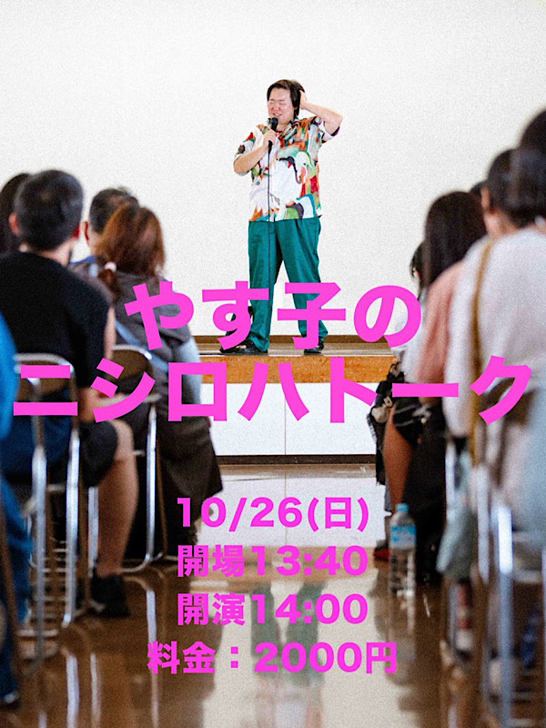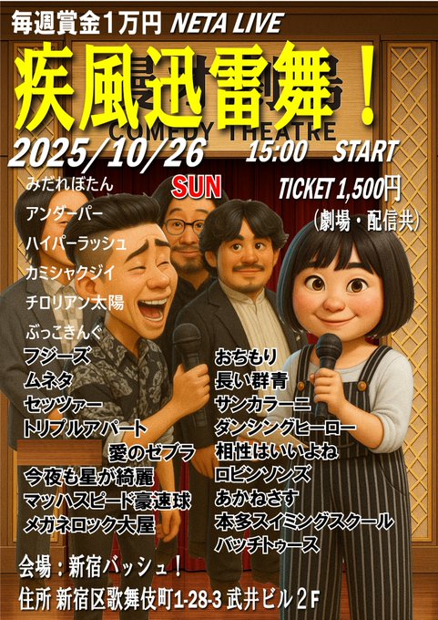 通し6000円 新道竜巳とタイ雑談 2025年10月26日(日) 阿佐ヶ谷産業商工会館和室 開場15時25分 開演15時30分 終演16時30分 前売り2000円 当日2500円 【内容】タイタン若手によるトークライブです。 【出演者】 浅桜ぽんず GOLF シェイク・ヒロシ しびれグラムサム 白丸 須藤ジム ツキオバランカ ひらおか族 藤元達也 枡野浩一 鎌 新道竜巳のネタやりたかったらやってもいいライブ 2025年10月26日(日) 阿佐ヶ谷産業商工会館和室 開場16時55分 開演17時00分 終演18時00分 前売り2000円 当日2500円 【出演者】 インザパーク エリザベス 金魚と強盗 クラッシャーマサキ スーパームチオ 杉並スラッシャーズ とんとん拍子 ツイタチ 畑・前島ペア 吉松ゴリラ