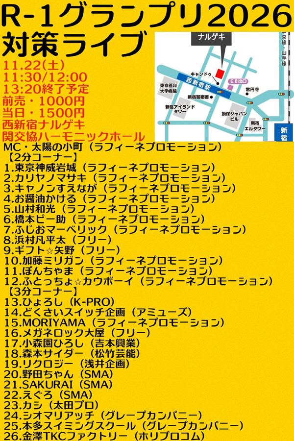 【2分コーナー】 1.東京神威岩城(ラフィーネプロモーション) 2.カリヤノマサキ(ラフィーネプロモーション) 3.キャノンすえなが(ラフィーネプロモーション) 4.お醤油かける(ラフィーネプロモーション) 5.山村和光(ラフィーネプロモーション) 6.橋本ピー助(ラフィーネプロモーション) 7.ふじおマーベリック(ラフィーネプロモーション) 8.浜村凡平太(フリー) 9.ギフト⭐︎矢野(フリー) 10.加藤ミリガン(ラフィーネプロモーション) 11.ぽんちゃま(ラフィーネプロモーション) 12.ふとっちょ⭐︎カウボーイ(ラフィーネプロモーション)