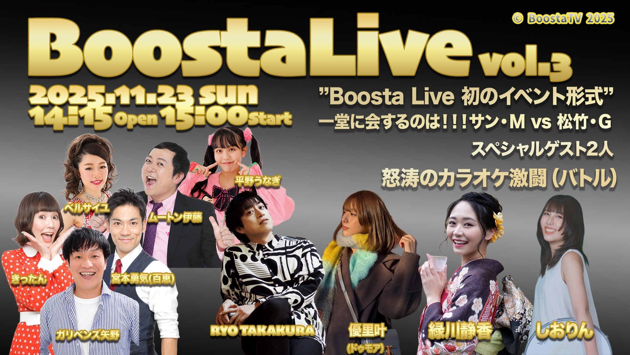 ””Boosta Live 初のイベント形式”” 一堂に会するのは!!! サン・M vs 松竹・G スペシャルゲスト2 怒涛のカラオケ激闘(バトル) 【開催概要】 日時:2025年11月23日(日曜日) 14時15分開場/15時00分開演 会場:Boostudio(ブゥスタヂオ) 出演者:#RYOTAKAKURA'(兼MC) #優里叶(歌手兼MC) サン・M #ガリベンズ矢野 #きったん #宮本勇気 松竹・G #ムートン伊藤 #ベルサイユ #平野うなぎ Special Guest #緑川静香(女優) #しおりん(アーティスト)