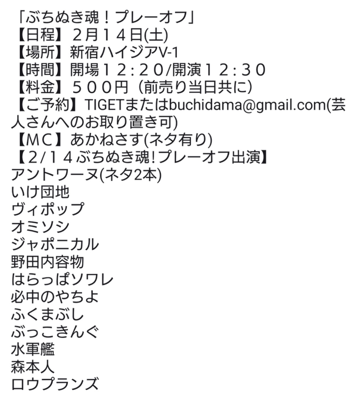 【ご予約】TIGETまたはbuchidama@gmail.com(芸人さんへのお取り置き可)